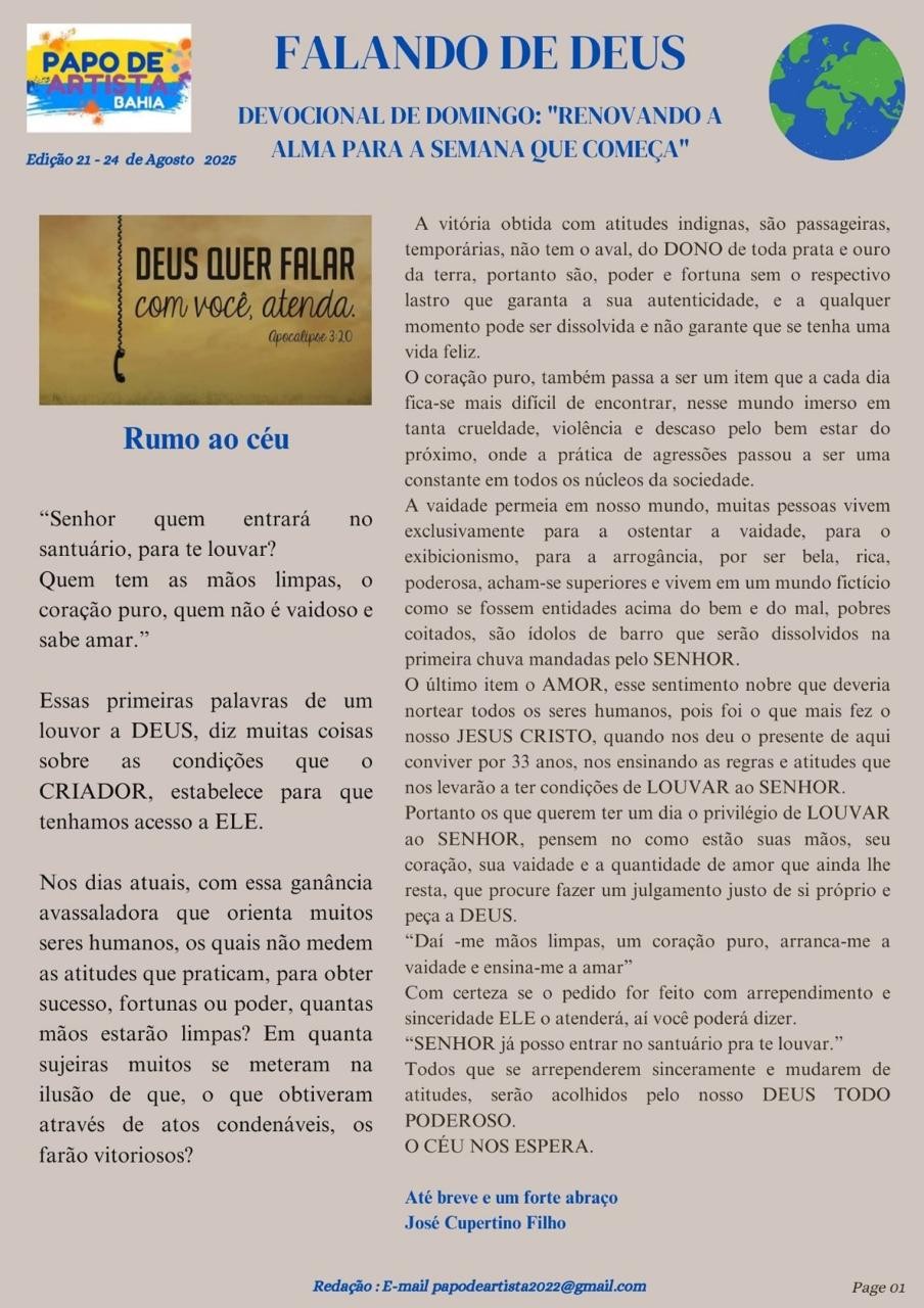 Bom dia! Você já agradeceu a Deus hoje? A gratidão transforma o coração e nos faz enxergar a vida com mais esperança e amor. Que possamos ser gratos por tudo que Ele tem feito em nossas vidas — até nas pequenas coisas que muitas vezes passam despercebidas. A gratidão abre portas que a ingratidão fecha. Clique no link acima e confira!👆🏻https://www.papodeartistabahia.com.br/palavradasemana