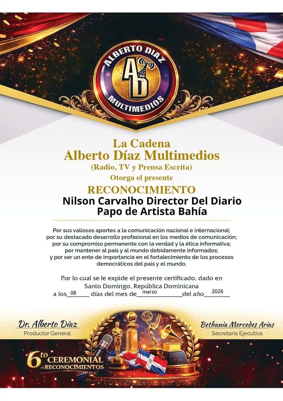 O jornalista Nilson Carvalho, diretor do jornal Papo de Artista Bahia, recebeu um importante reconhecimento internacional concedido pelo Alberto Díaz Multimedios, uma rede de comunicação que reúne rádio, TV e imprensa escrita na República Dominicana.